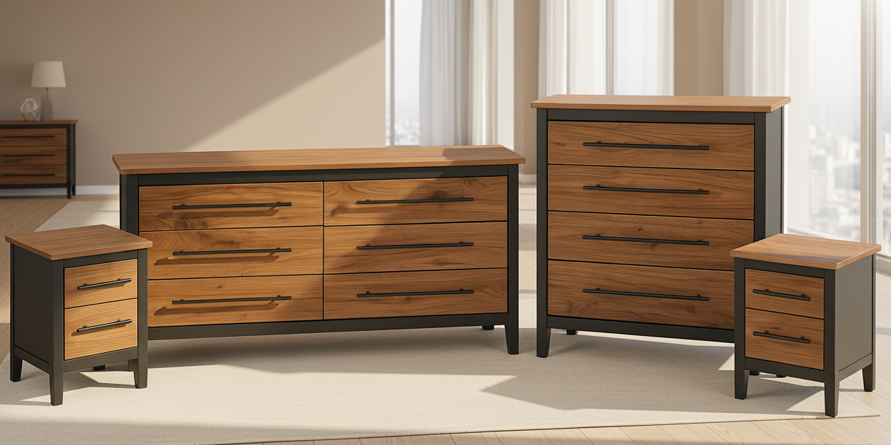 60" Modern 6 drawer dresser in iron finish with walnut fronts and top.