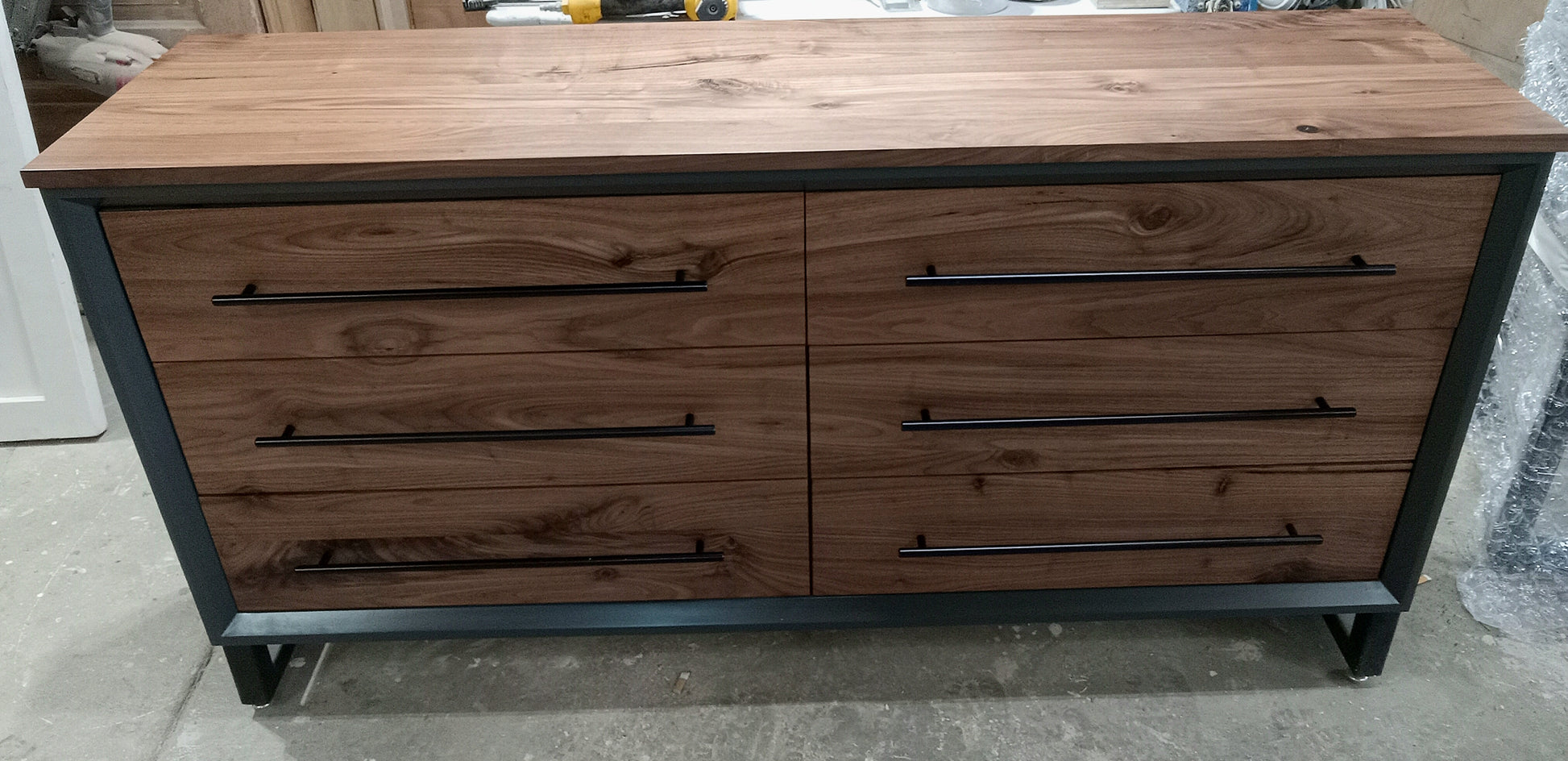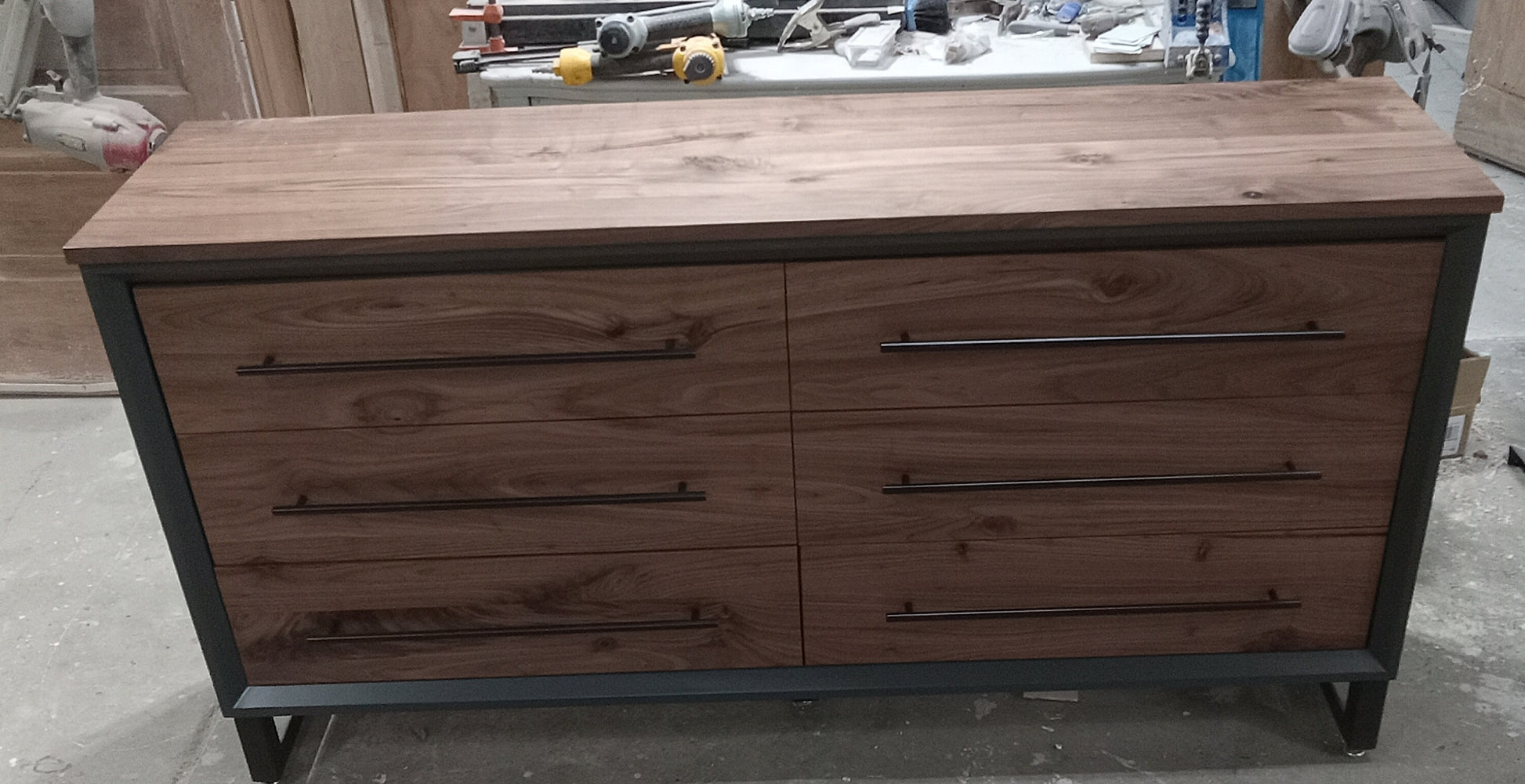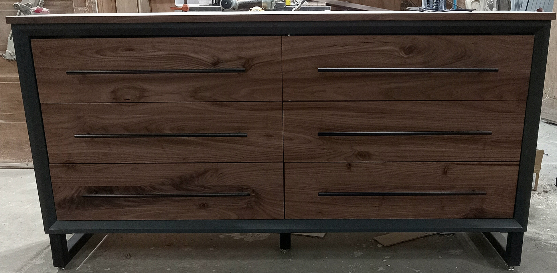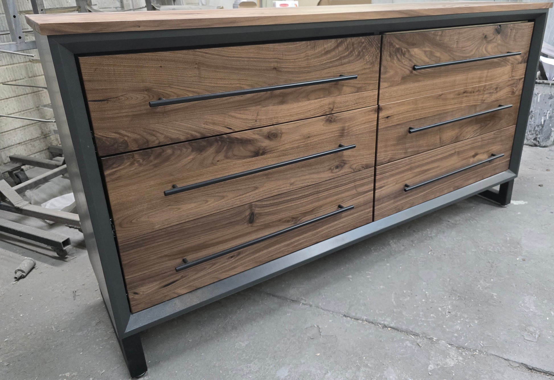 Elevate your bedroom with our modern 6 drawer dresser. Measuring 60l x 36t x 17d, it boasts a sleek iron finish with luxurious walnut drawer fronts and tops. Sturdy steel legs, adjustable feet, soft close drawers, and dovetail construction add both style and functionality to this elegant piece. Each piece is meticulously handcrafted to order.