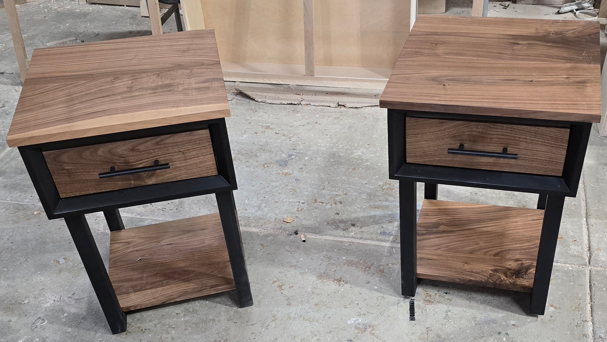 Modern Black and walnut nightstand with drawer and shelf on steel legs.